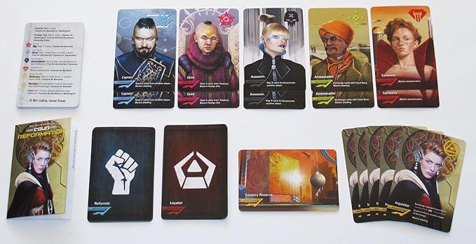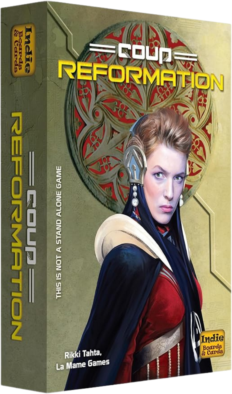 Coup: Reformation, an expansion for the original version of Coup: City State from La Mame Games, adds new cards to the game and rules for factions and team play that increases tension in the early stages for four or more players and (thanks to 15 additional character cards) allows Coup to be better played with up to ten players.