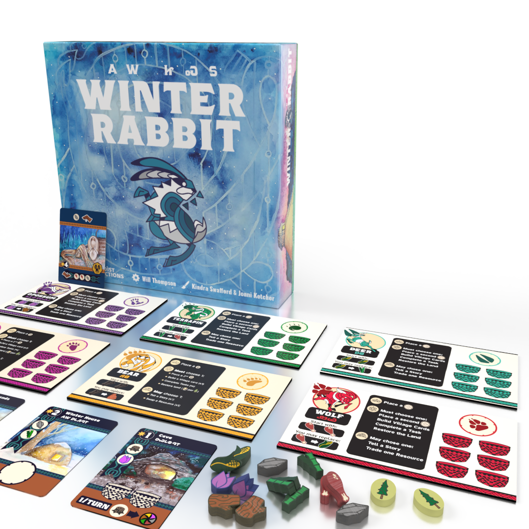 Winter Rabbit is set in the world of traditional Cherokee animal stories, where each player takes on the role of one of the animal characters. In this semi-cooperative game, players cooperate to provide everything the village needs for winter while also competing to see who can contribute the most.