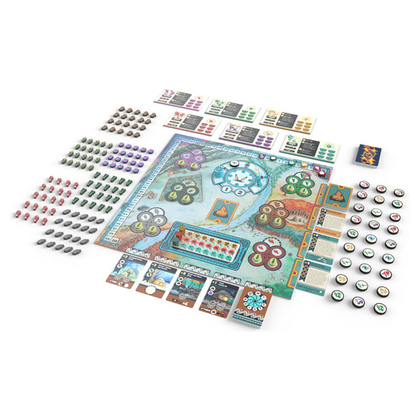Players can spend resources to build their personal engine through village cards. They can also spend resources on stories that affect the game for all players, or complete tasks that score points, progress the game, and provide a benefit to another player.