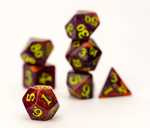 These spicy dice are a transparent deep magenta with iridescent glitter with an opaque swirl of orange and yellow-green font.