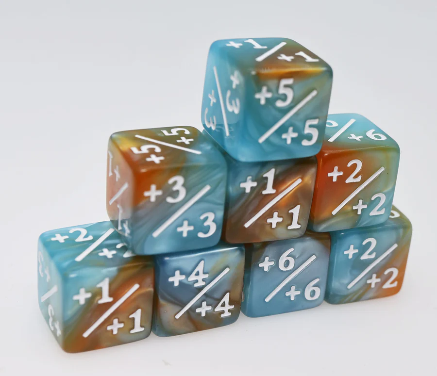 These special d6 counters are marked with +1/+1 through +6/+6 and come in a set of 8. Perfect for keeping track in your favorite deck-builders!