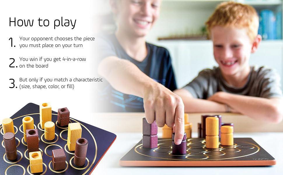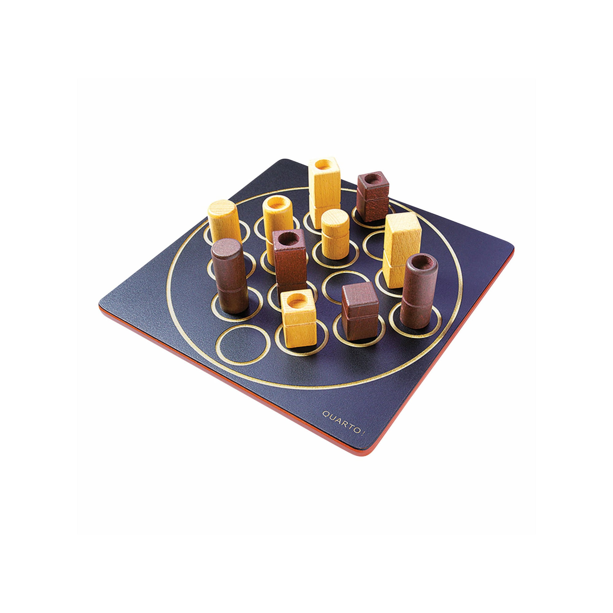 Quarto has a 4×4 board and 16 pieces. Each piece has four dichotomous attributes — color, height, shape, and consistency — so each piece is either black or white, tall or short, square or round, and hollow or solid. The object is to place the fourth piece in a row in which all four pieces have at least one attribute in common. The twist is that your opponent gets to choose the piece you place on the board each turn.