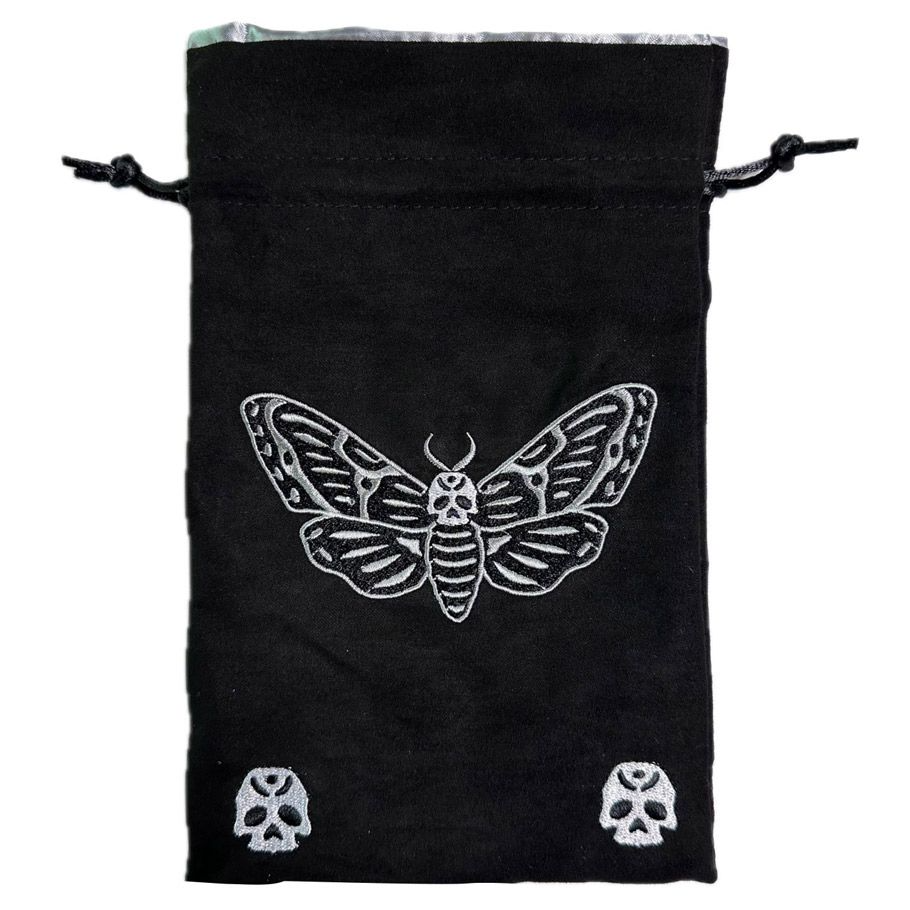 The striking Death's-Head Moth features silver embroidery from a top view. Two skulls adorn the bottom corners of the dice bag. The dice bag is black and the satin liner is silver.