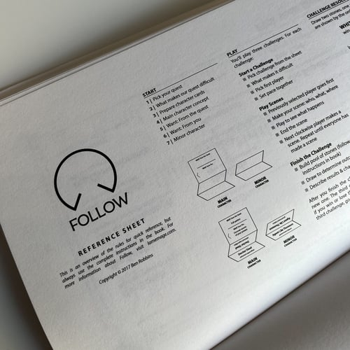 Follow is designed to be easy to learn and easy to play. For 3-5 players, no GM and no preparation. All the steps are clearly and carefully laid out to make the game accessible to everyone — even if you’ve never seen a role-playing game before. If you have some people and time, you’re ready to play. Created to be a reliable tool in your arsenal, a game you can pull out and play at a moment’s notice.