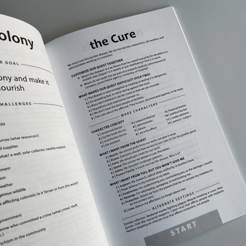 Play characters working together to achieve a common goal: your quest. The quest you pick decides the kind of game you’ll play. You could start a rebellion, cure a disease, slay a dragon (or a cat), or get your candidate elected. If it’s something people can work together to accomplish, it could be a quest.