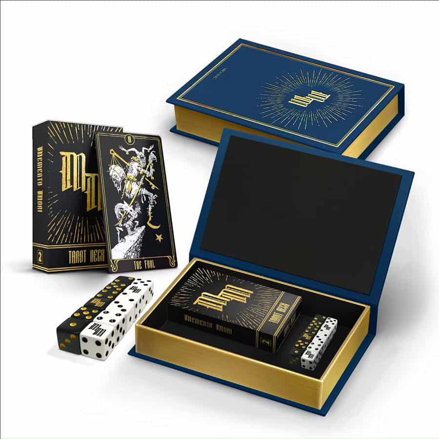 This box holds the most precious materials from this edition of Memento Mori. The Tarot deck and the custom-made dice, as well as 6 printed Binding Pacts and the Blades of Ruin bookmarks.