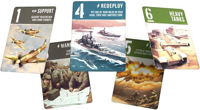 As a general, you must carefully deploy your forces across three possible theaters of war: air, land, and sea. If you can control two out of three of these theaters, you will win the current battle. But winning a single battle is not enough to win the game. And in fact, sometimes you may want to surrender and lose a battle on purpose in order to win the larger war. Revised Edition contains requests from fans of the game including new icons on the cards indicating the theatre, rulebook cleanup/clarifications and improved saturation of color.
