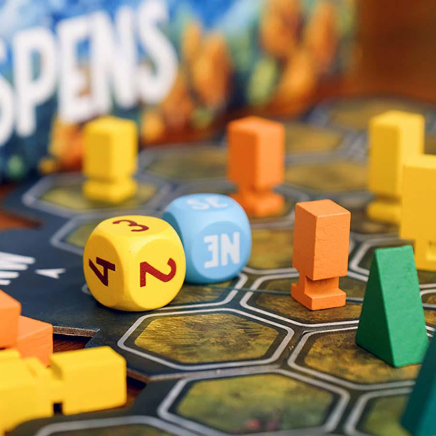 Aspens is a quick-to-learn and deceptively strategic game about growing the largest, most stunning forest! Each round, players take turns rolling the Sun and Wind dice to plant trees; but only for spaces they’ve grown tall enough to capture the light. Players can grow forests UP to increase their odds of gaining trees in future rounds or expand OUT to take spaces from their opponent. The player with the most spaces at the end of the game wins! Aspens is the perfect blend of approachable strategy and a dash of luck that players LOVE!