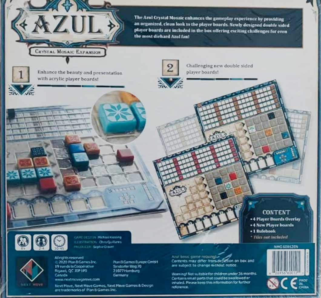 The Azul Crystal Mosaic enhances the gameplay experience by providing an organized, clean look to the player boards. Newly designed double-sided player boards are included in the box offering exciting challenges for even the most diehard Azul fan!