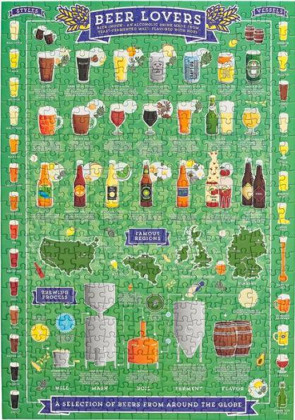 Beer lovers -- crack open a cold one and toast to this Beer Lover's Jigsaw Puzzle from Ridley's Games! Learn about popular beer varieties and regions when solving the beautiful, hand-illustrated puzzle and refer to the poster guide to help you along. This 500 piece jigsaw is the perfect gift for any avid beer drinker, featuring a collection of beers, lagers, pilsners and ales, all packaged in a beer can style tube.