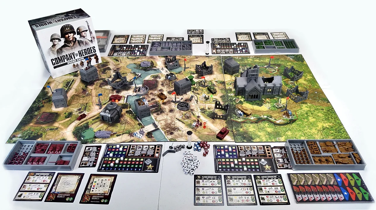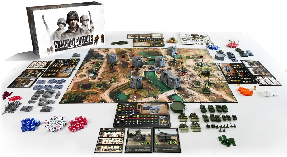 Company of Heroes, the World War 2 board wargame, is based on the video game from Relic/Sega. It closely captures the choices, tactics and mission strategies of the videogame. In teams, or as individuals, players will maneuver units and battle for control points to collect manpower, munitions and fuel. Players spend these resources to construct new buildings, purchase units and upgrade abilities, eventually unlocking the powerful end-game units of their nation.