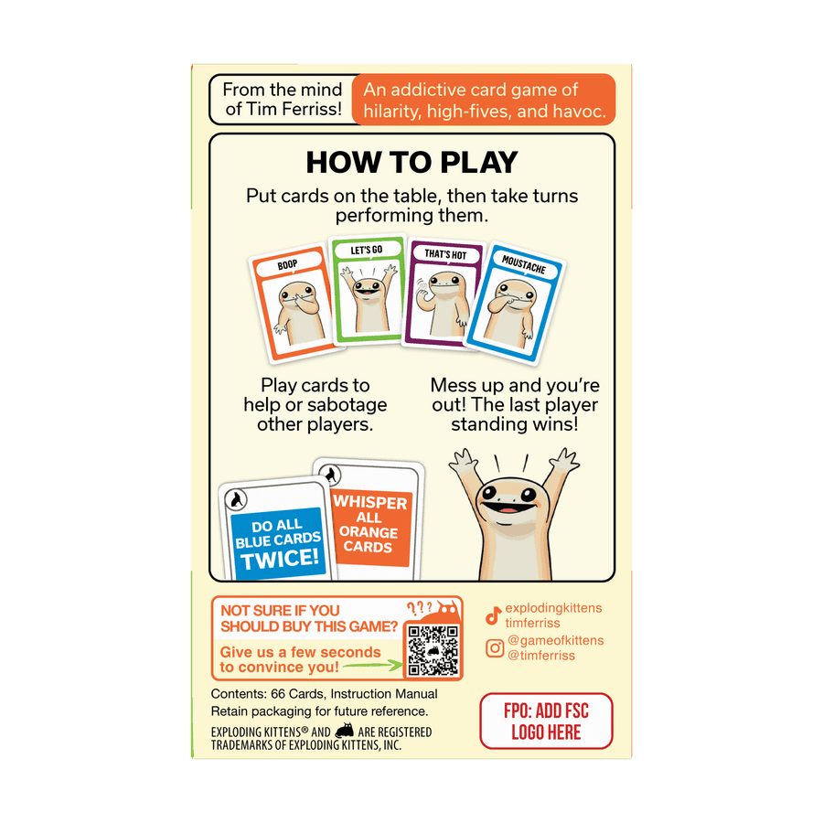 From the mind of Tim Ferriss comes a mental obstacle course where you’ll have to think fast, act faster, and stay on the beat to win. Put Cards on the table, then take turns performing the Actions on the Cards while banging out a beat on the table. Add new Cards and Modifiers to the row of Cards to sabotage other players. Mess up the beat or the action and you’re out. The last player standing wins!