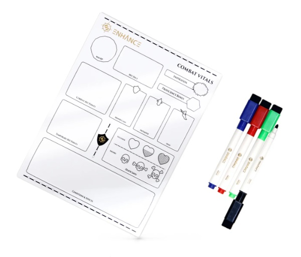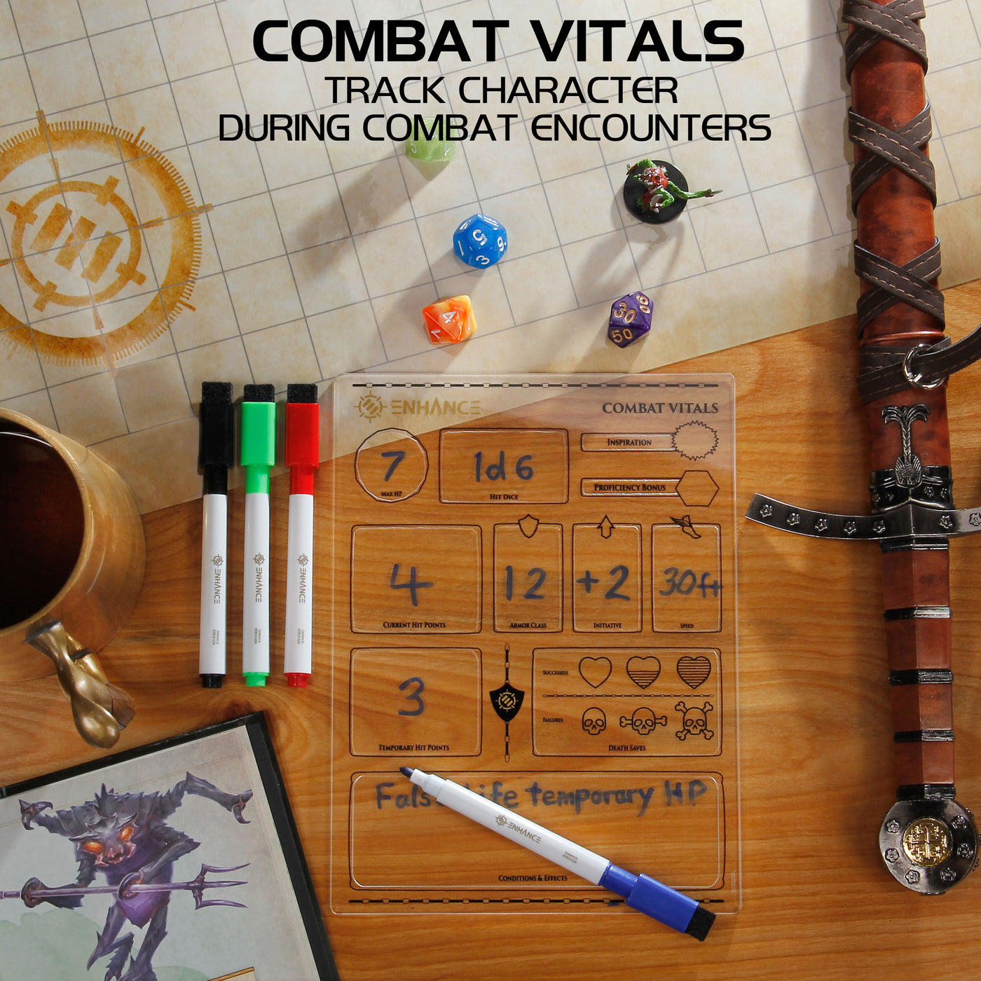 The ENHANCE Tabletop Acrylic Character Sheet Set includes three 8 inch x 6 inch sheets that enable tracking of resources and abilities on erasable templates that will outlast your longest campaign adventures.