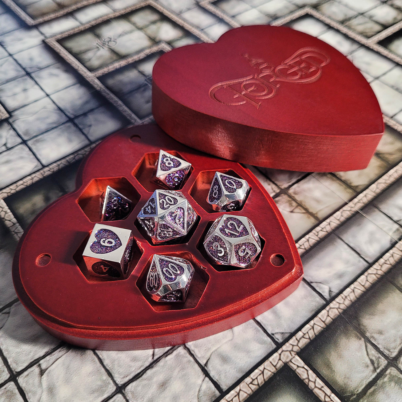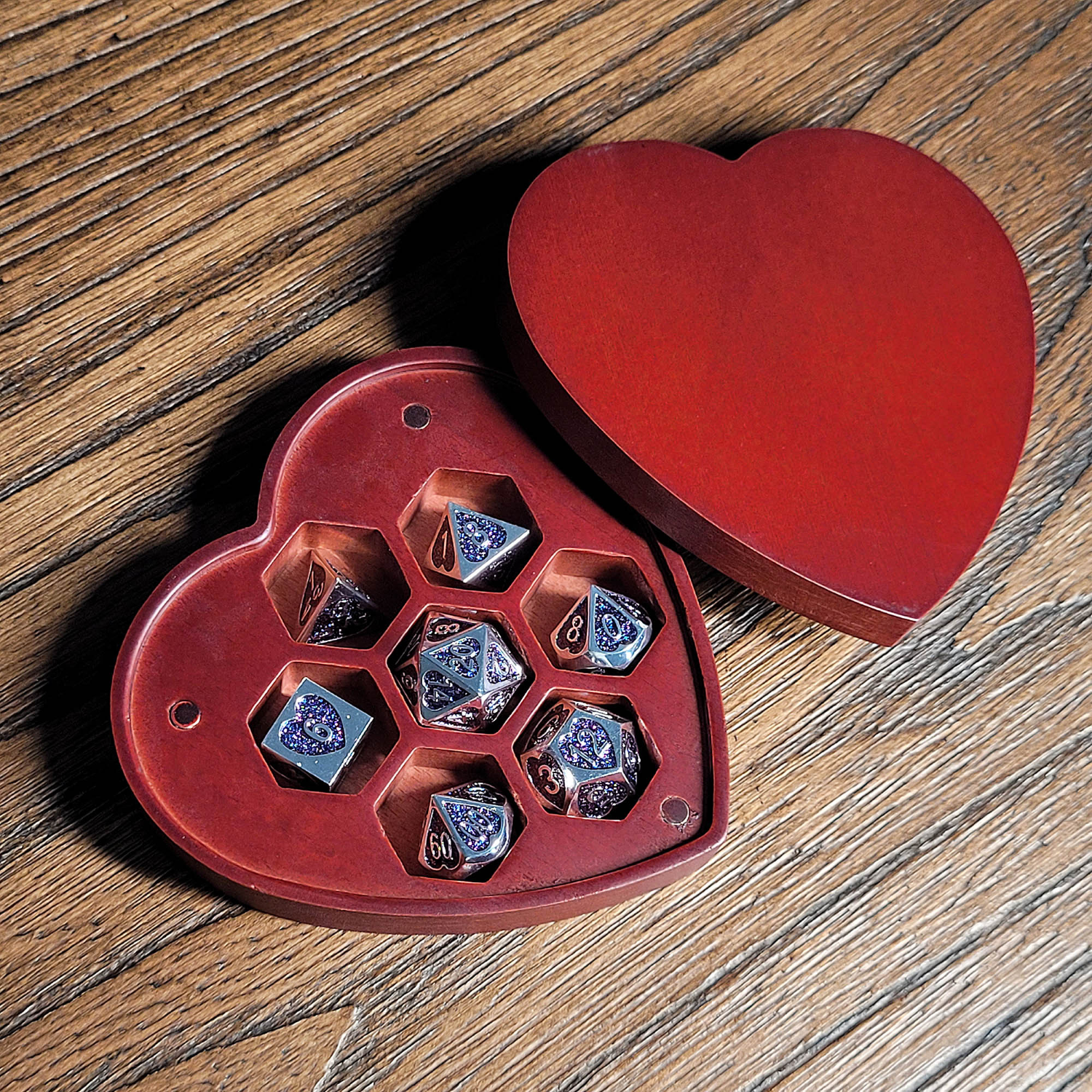 Forged Gaming: Soaring Heart - Metal RPG Dice Set with Custom Wooden Dice Box - Red