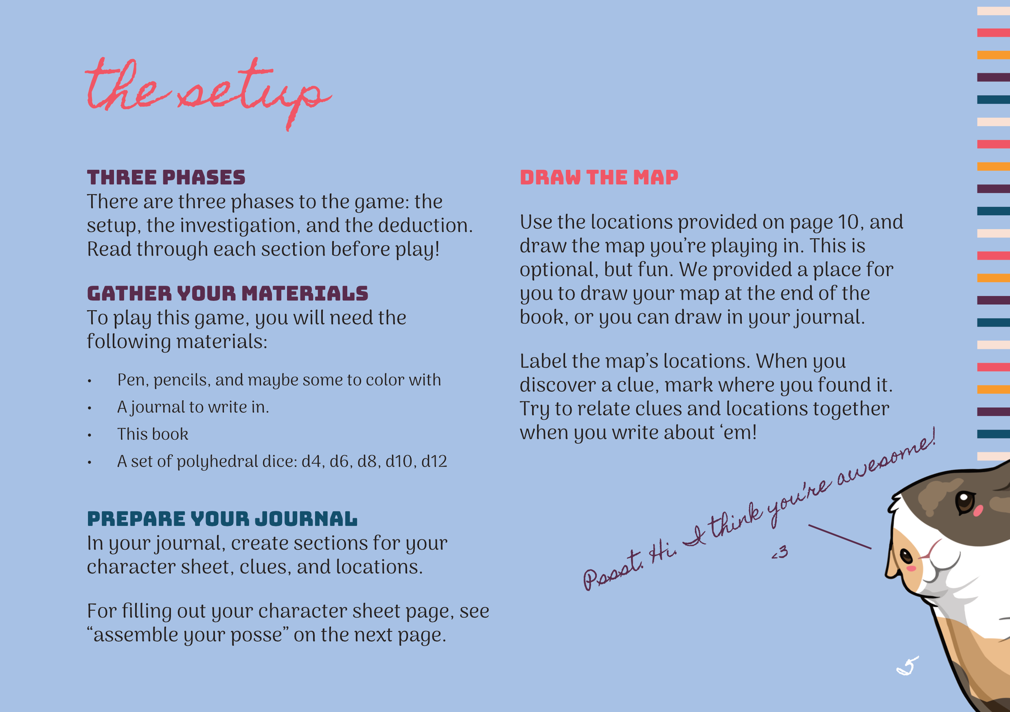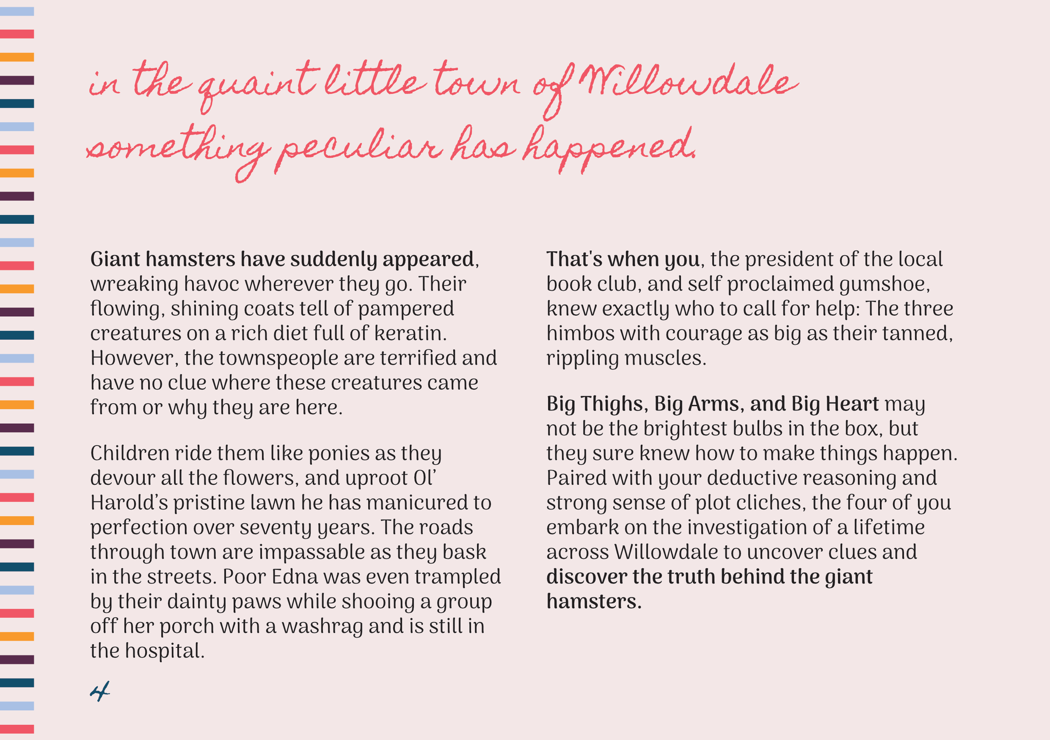 Big Thighs, Big Arms, and Big Heart may not be the brightest bulbs in the box, but they sure knew how to make things happen. Paired with your deductive reasoning and strong sense of plot cliches, the four of you embark on the investigation of a lifetime across Willowdale to uncover clues and discover the truth behind the giant hamsters.