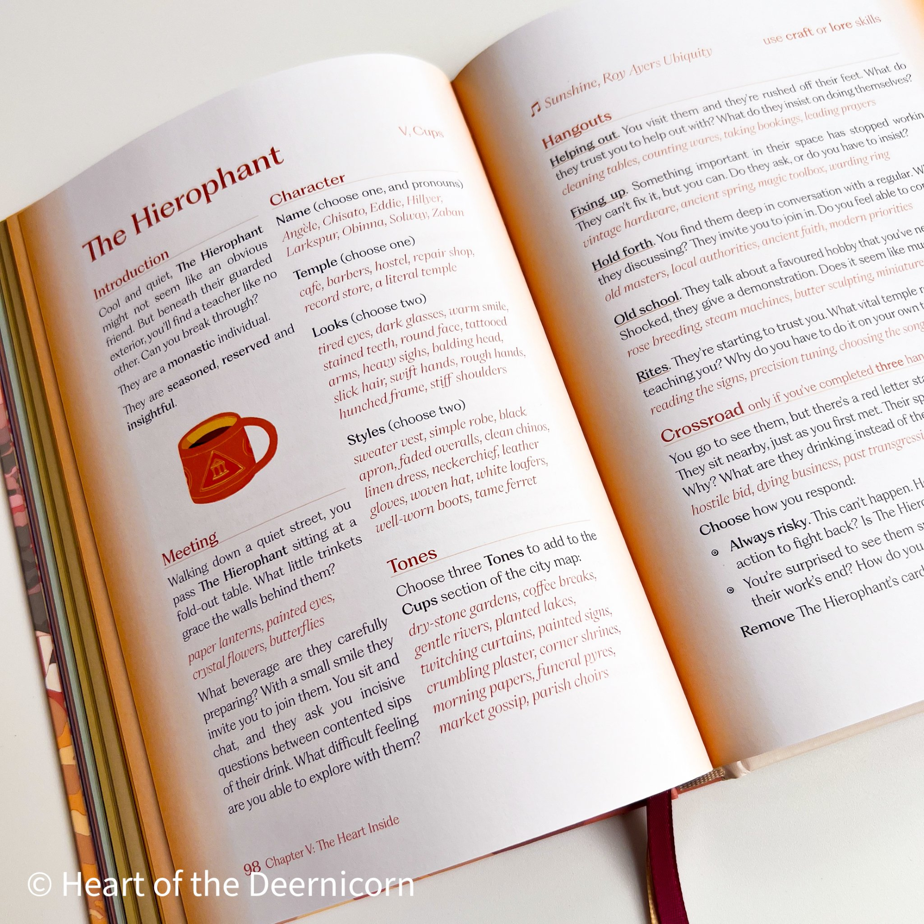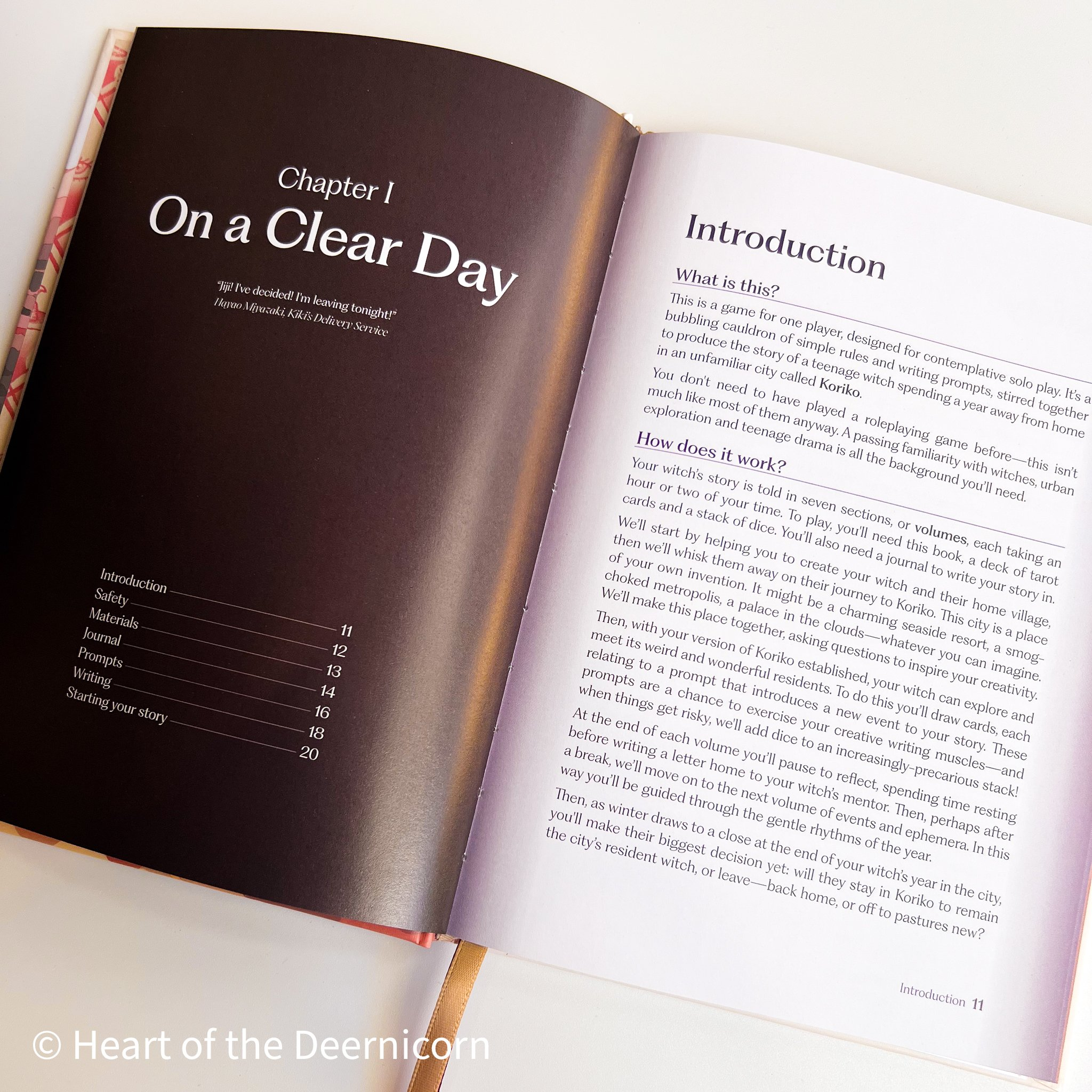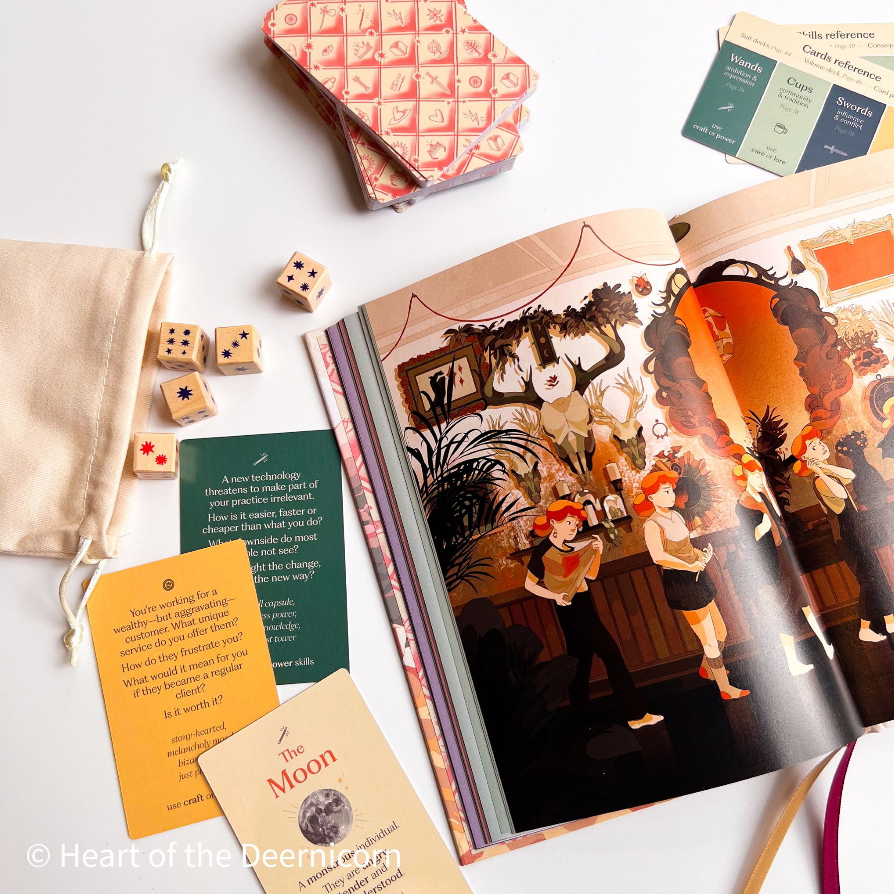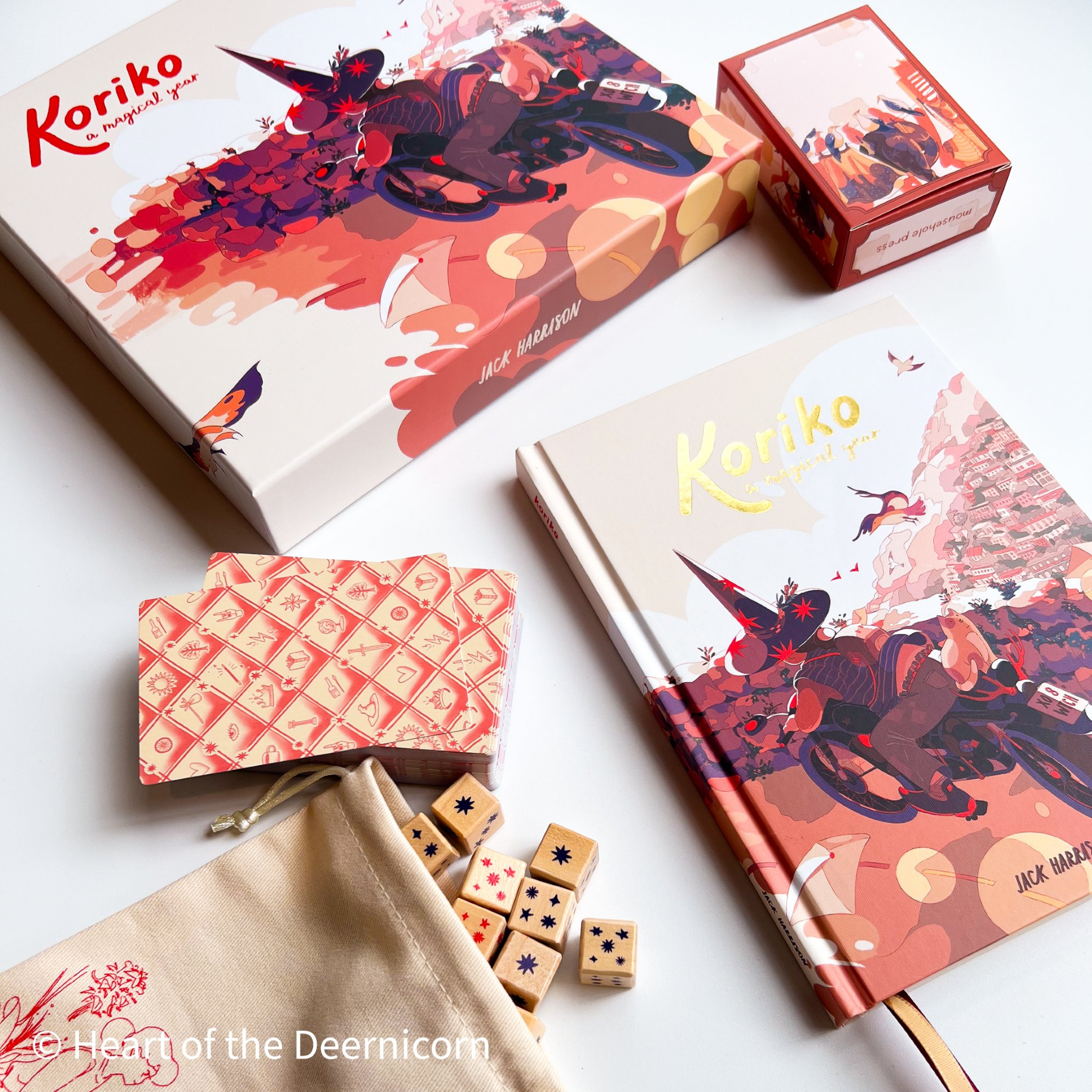 Koriko: A Magical Year is a solo game designed for contemplation. It’s a bubbling cauldron of simple rules and writing prompts, stirred together to produce the story of a teenage witch spending a year away from home in an unfamiliar city—Koriko. You’ll use the book, a deck of tarot cards and a teetering tower of dice to explore the city, work to improve your witch’s fortunes and meet some of the city’s weird and wonderful residents.