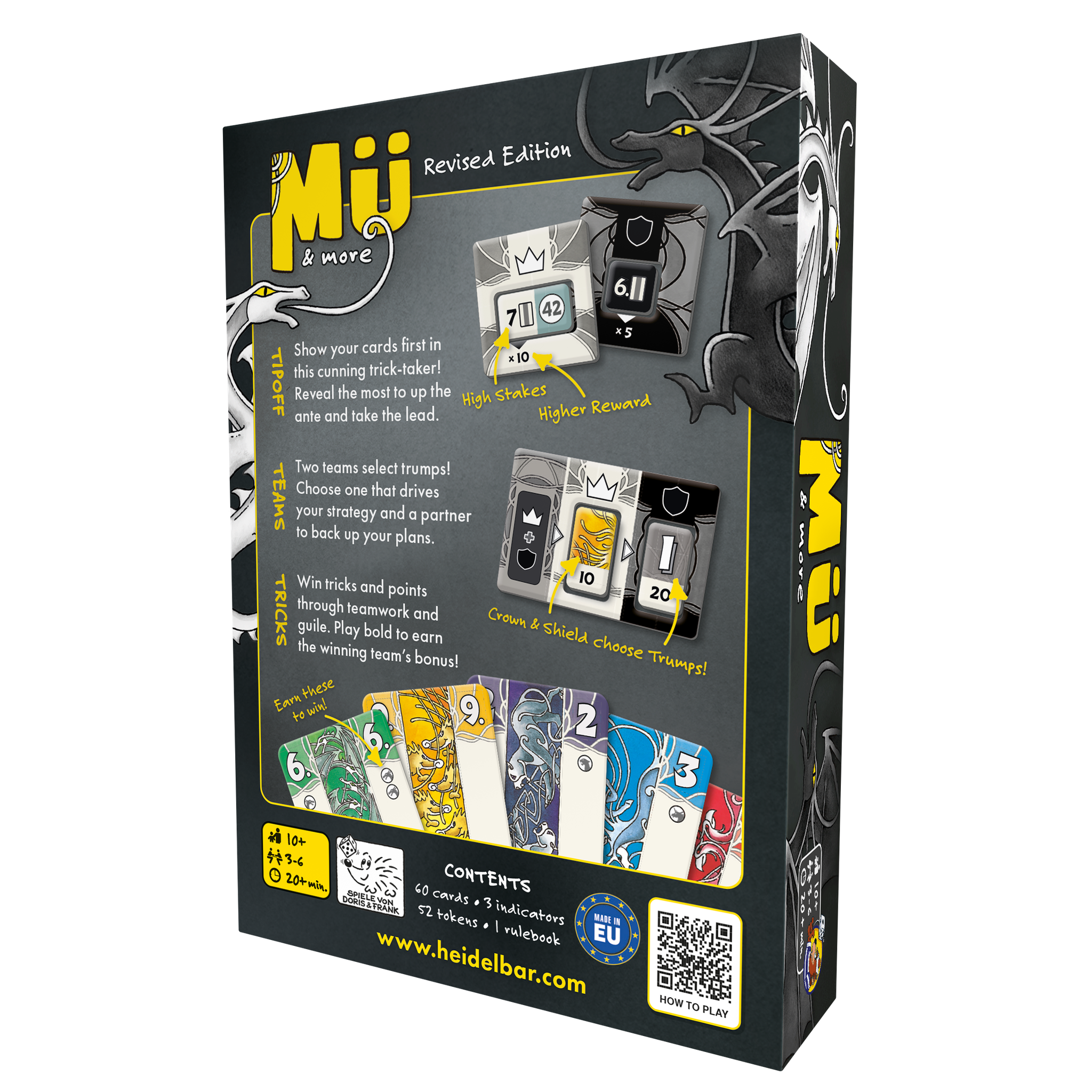 Mü & More is a trick-taking game that is played over several games in alternating teams and offers unique game elements.