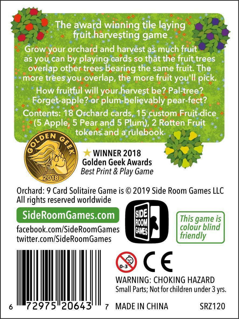 Orchard is a quick solitaire 'tile laying' game that plays in under 10 minutes. The aim of the game is to harvest fruit (score points) by playing cards so that their fruit trees overlap other trees already in the orchard that bear the same fruit. The more trees you can overlap, the more fruit you'll pick.