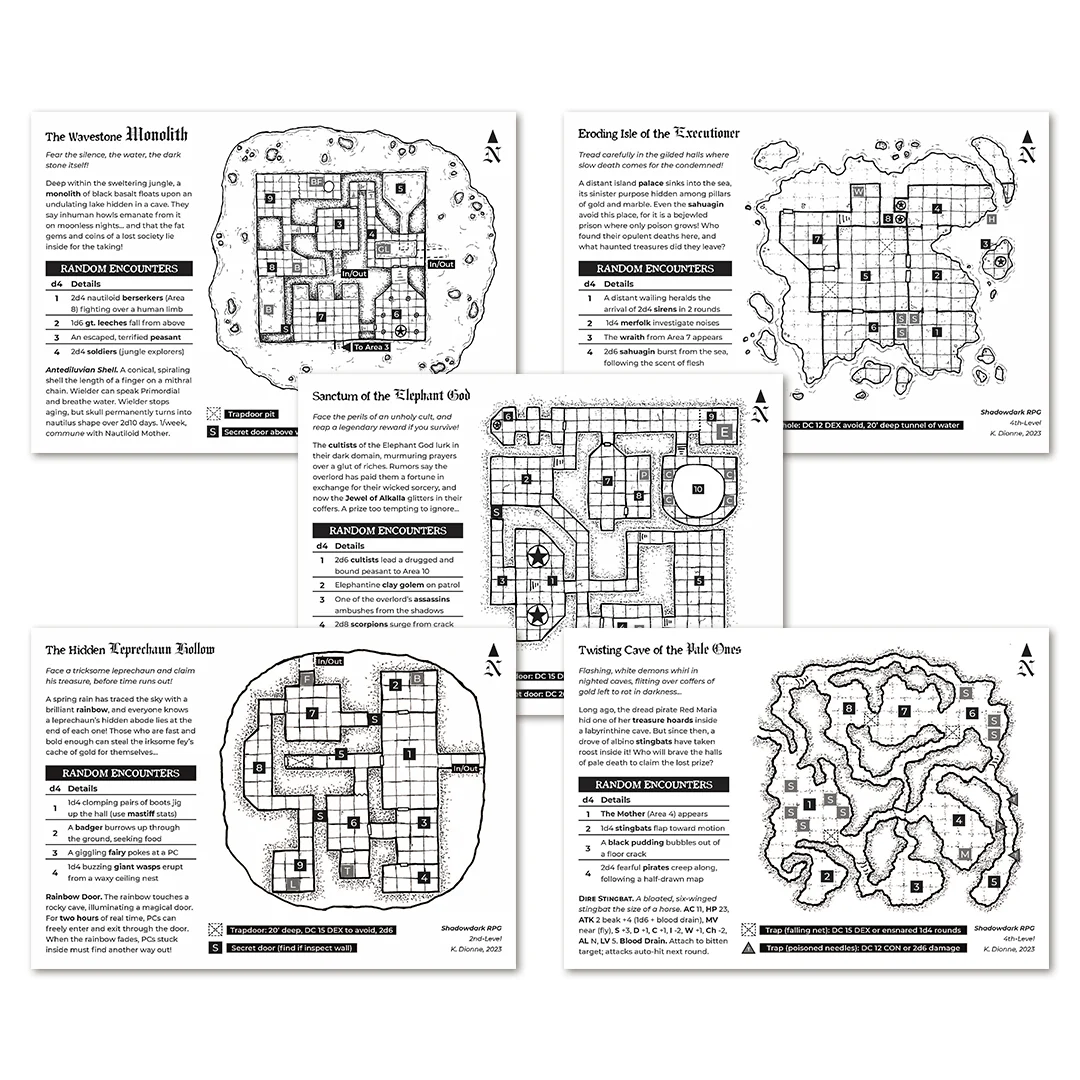 These handy, two-page adventures (front and back) are printed on heavyweight cardstock. They give you all you need to run: