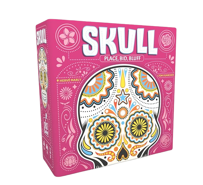 An ancient game of ornate skulls and dangerous roses, Skull is simple to learn but dangerously difficult to win. You must bluff, lie and pierce through the deceptions to expose the roses. Be wary, though - if you happen across a skull, the consequences are dire! Players will hold three rose cards and one skull. Add a card to the pile in front of you and when you feel lucky, announce your challenge and declare how many cards you will flip. Cards that show a rose are safe, but if you expose your opponent's hidden skull, you lose one of your own cards. Keep your cards to the bitter end to win this clever game of deception and perception!
