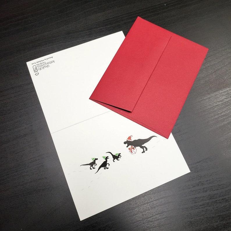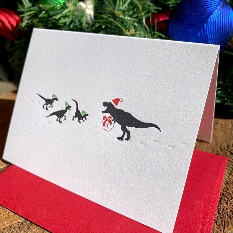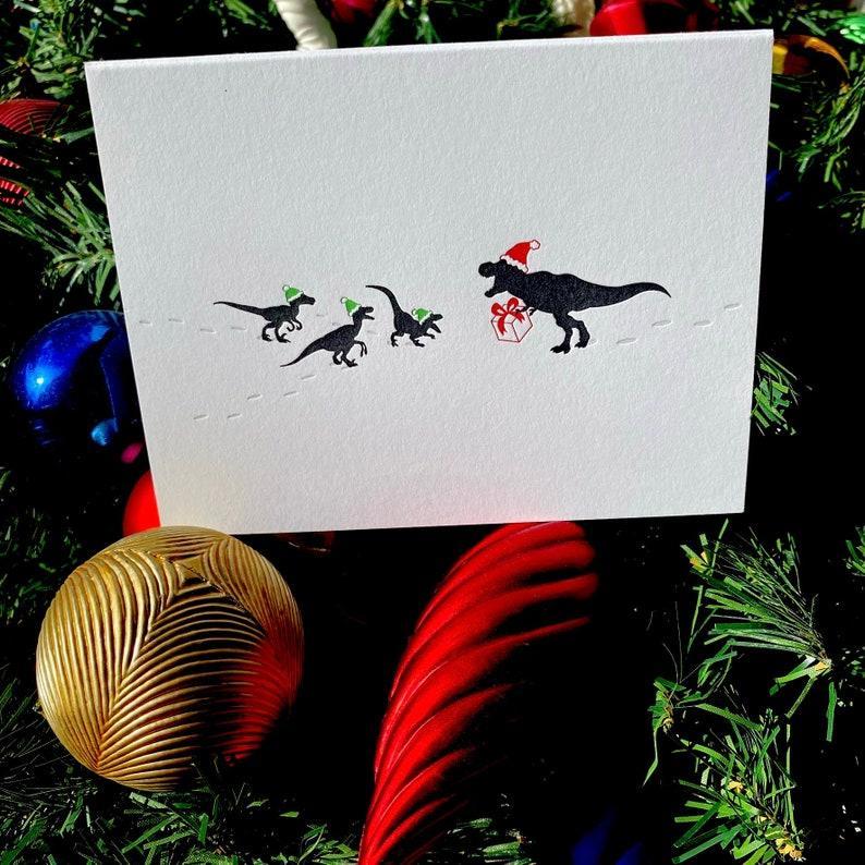 Skylab Letterpress: Dino Holiday Party Holiday Card - A2 Sized Letterpressed Blank Greeting Card