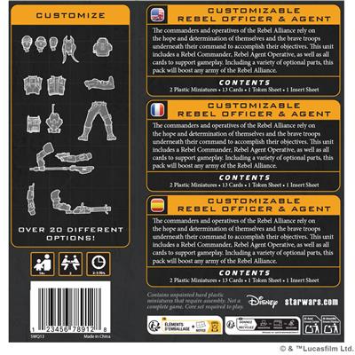 This pack includes over 20 optional parts players can choose from when assembling their miniatures, allowing for a huge range of personal customization for each character. Players also customize their Rebel Officer and Agent’s in-game abilities using the 9 unique Upgrade cards included in this expansion. Each of these unique upgrades dramatically changes the battlefield role, abilities, and synergies the character brings to the army.