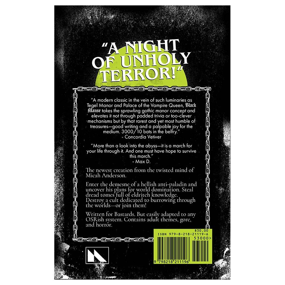 The newest creation from the twisted mind of Micah Anderson! Enter the demesne of a hellish anti-paladin and uncover his plans for world domination. Steal dread tomes full of eldritch knowledge. Destroy a cult dedicated to burrowing through the worlds—or join them! The Black Manse is a gothic horror adventure in the classic style, written for any fantastic roleplaying game of your choosing. Experience a night of unholy terror!