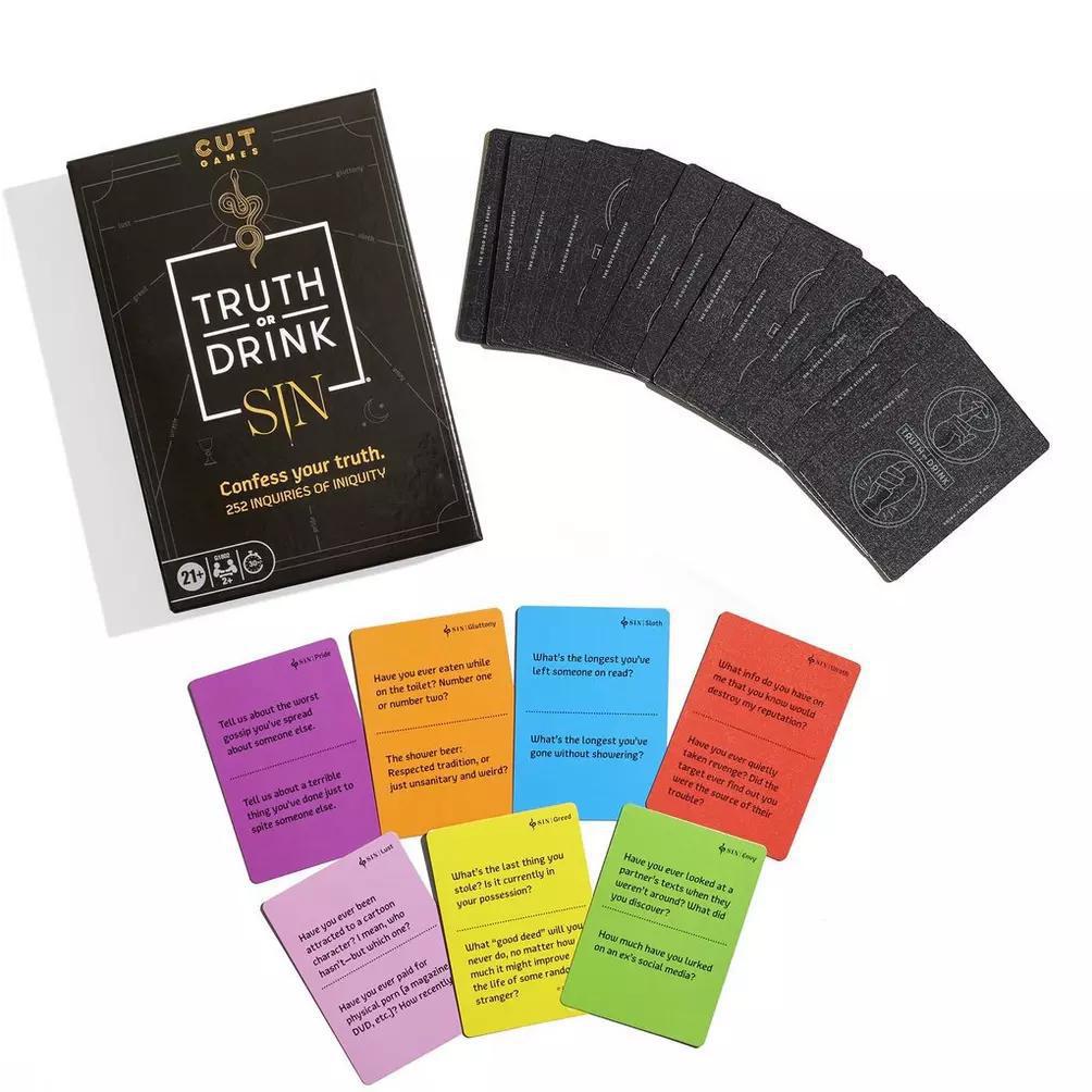 Tell the truth or take a drink. It’s time for the ultimate confession in the Truth or Drink: Sin Edition game! Based on the hit video series, the Truth or Drink games are the card games of honesty and hydration, and this edition offers a sinful spin. Get your friends and family to reveal their guilty pleasures with 250+ questions inspired by the classic Seven Deadly Sins. No topic is off-limits, and there’s nowhere to hide. Will you spill the truth or take a sip? The Truth or Drink: Sin Edition card game is sure to make some memorable stories at your next get-together. Play it as a stand-alone game or as an expansion to any other Truth or Drink game. Cut games are hysterical adult party games for game night, and NSFW games and travel games make cool gifts for adults ages 21+.